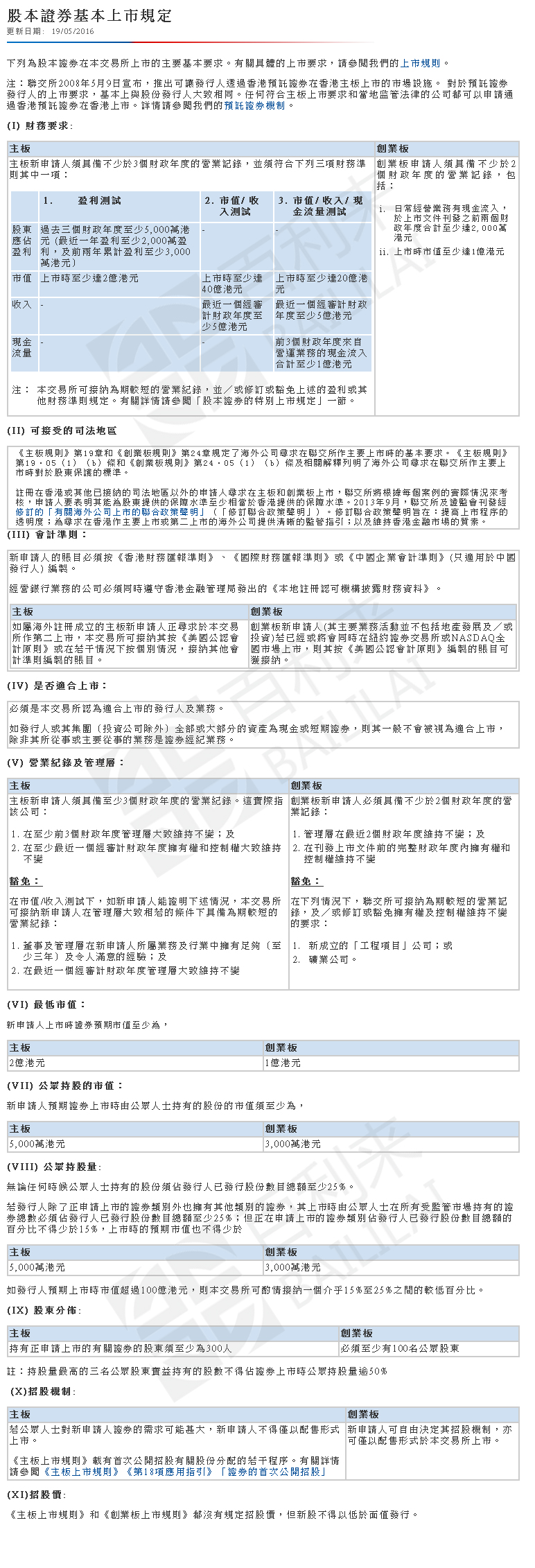 | 盈利要求 | 須具備3年的營(yíng)業(yè)記錄,過(guò)去3年盈利合計(jì)5000萬(wàn)港元(最近一年須達(dá)2000萬(wàn)港元,再之前兩年合計(jì)須達(dá)3000萬(wàn)港元),在3年的業(yè)績(jī)期,須有相同的管理層; | 不設(shè)最低溢利要求,但一般須顯示有24個(gè)月的活躍業(yè)務(wù)和須有活躍的主營(yíng)業(yè)務(wù),在活躍業(yè)務(wù)期,須有相同的管理層和持股人; |